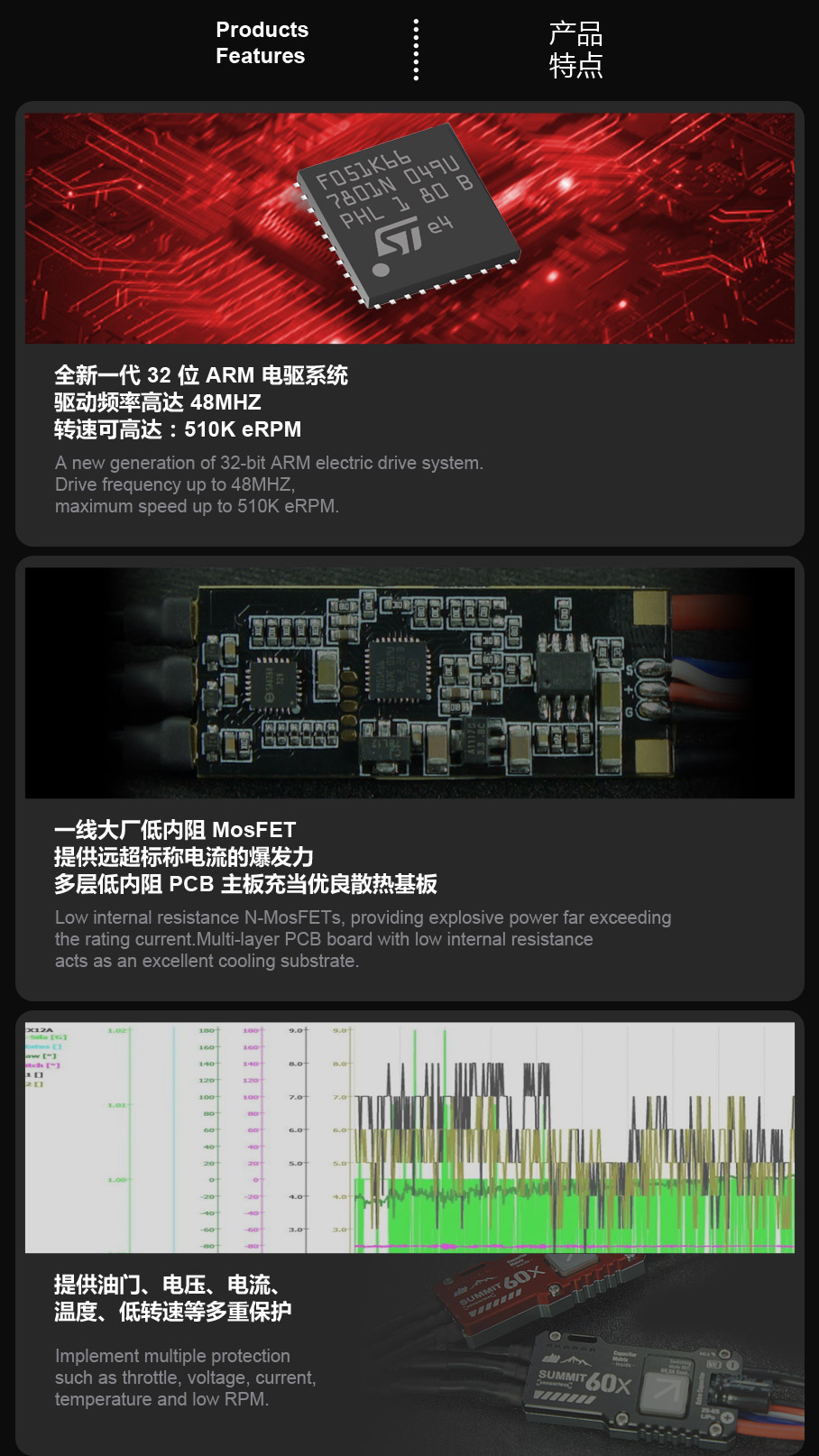 SUMMIT 60X.U8 - 60 amps, 2S-6S Lipo - UBEC 8V, 5A Cont./10A Peak - Full CNC ALU. cases - 32-bit ARM core, supports EA, GA motors - Fully programming |