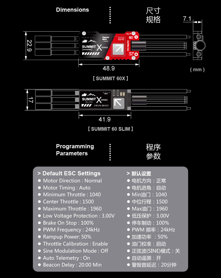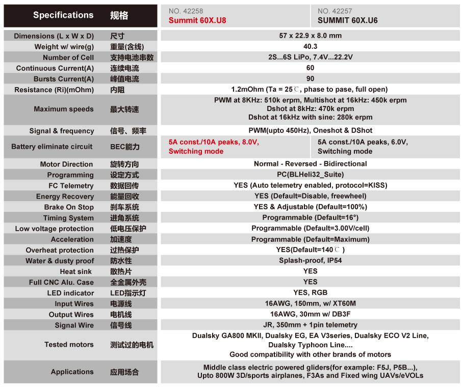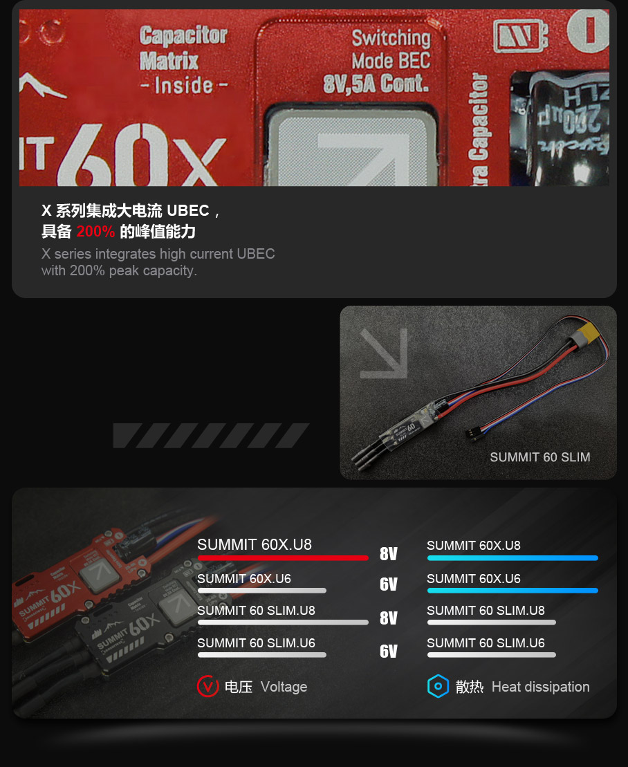 SUMMIT 60 SLIM U8 - Slim design, 60 amps S.O.T.(Short Operating Time), 2S-6S Lipo - UBEC 8V, 5A Cont./10A Peak - 32-bit ARM core, supports EA, GA motors - Fully programming |